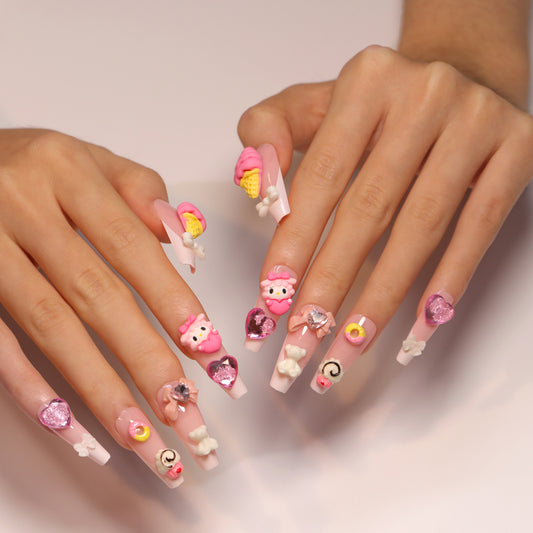 Ice Cream Cream Bear Handmade Almond Nails A1089