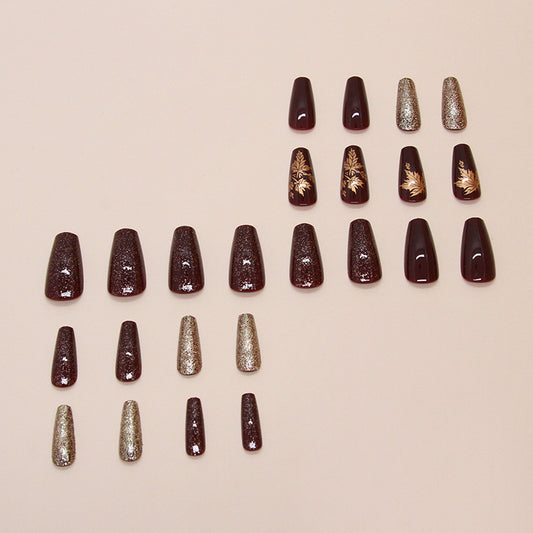 Amber Golden Maple Leaf Coffin 24PCS Free Size Press on Nails W1836