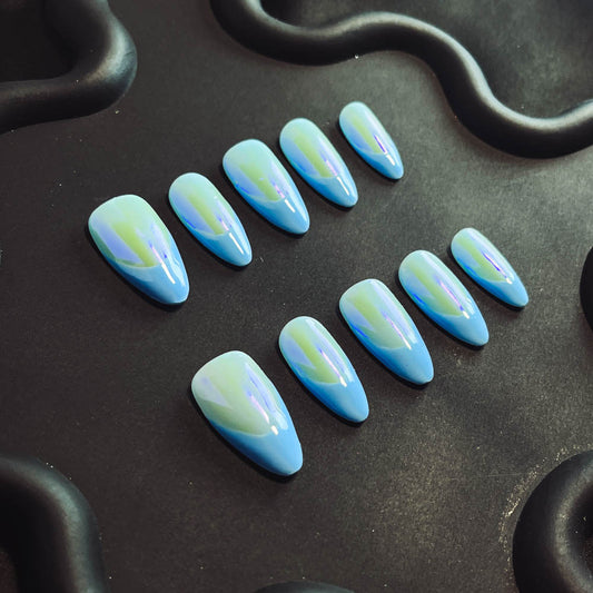 Blue Aurora French Tip Handmade Almond Nails X1014
