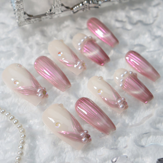Peach Freshwater Pearl French Tip Handmade Coffin Nails A402