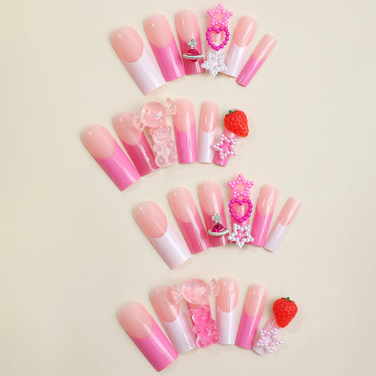 3D Rhinestone French Border Candy Heart Pearls Extra Long Duckbill Press On Nails