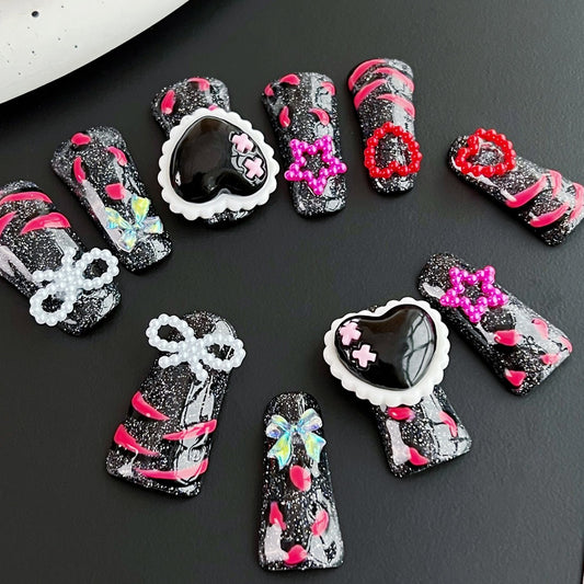 Pressons Black Heart Print Extra Long Duckbill Press On Nails