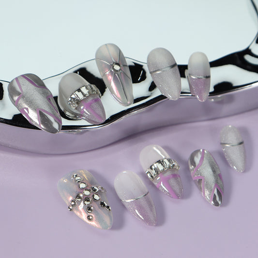 Star Cat's Eye French Tip Handmade Almond Nails A919