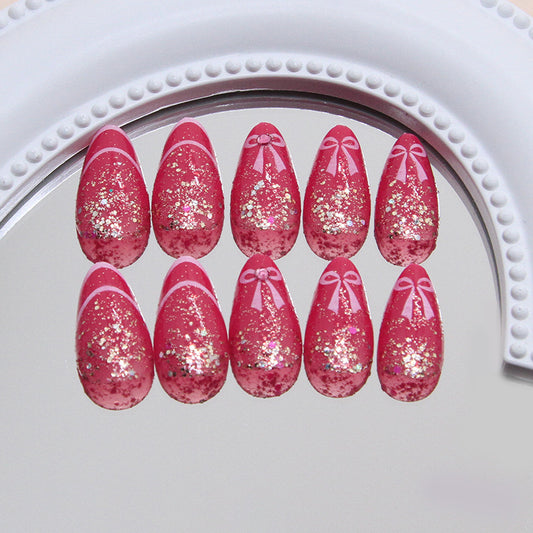 Hollow French Flash Bow Almond 24PCS Free Size Press on Nails Z1003
