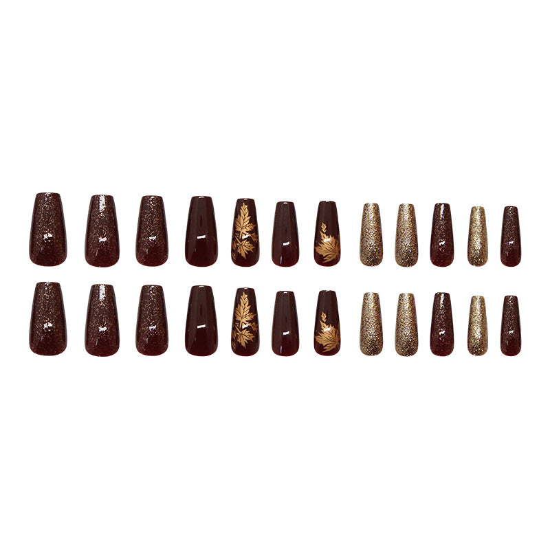 Amber Golden Maple Leaf Coffin 24PCS Free Size Press on Nails W1836