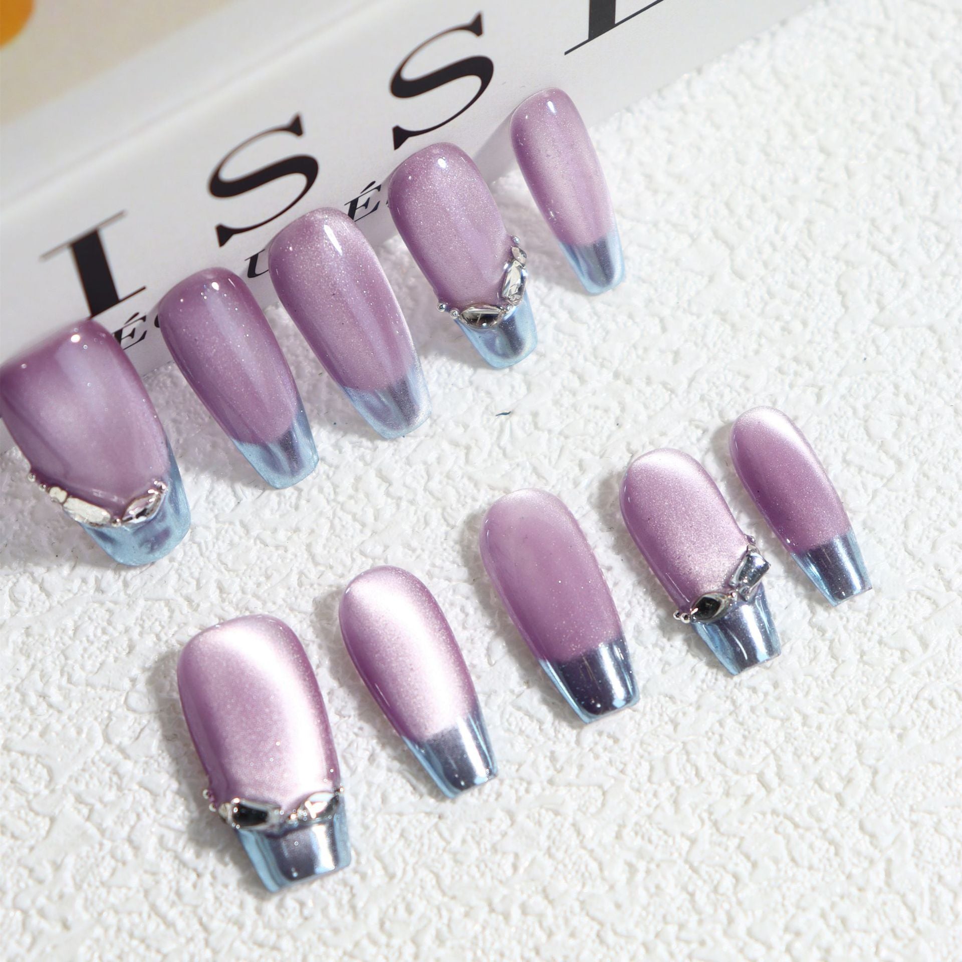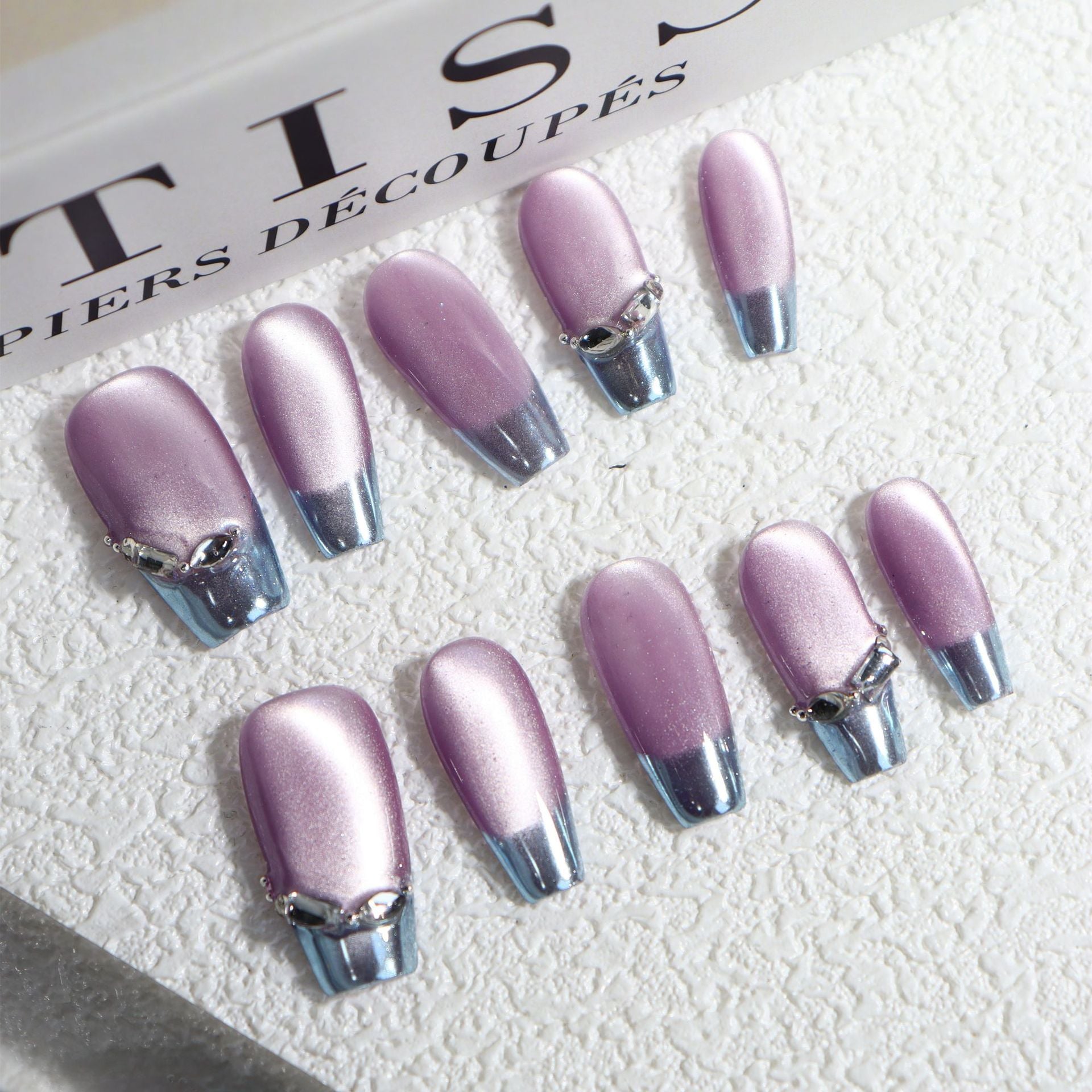 Violet Cat Eye Glue Handmade Coffin Press on Nails A439